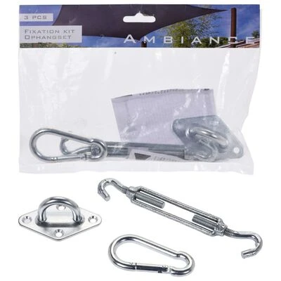 Vous pouvez commencer à fixer la toile d’ombrage à un mur ou à un poteau en montant la plaque avec œillet sur le mur / poteau. Après cela, accrochez l’écrou de tension avec le mousqueton à cet œillet. Ce mousqueton est suspendu à une chaîne sur le tissu d’ombrage.