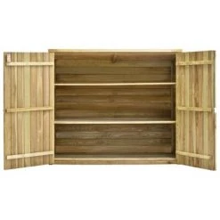 Équipé de trois grandes étagères, cet abri est parfaitement conçu pour les outils de jardin, le matériel d’entretien des pelouses, les fournitures pour la piscine, etc. Construit avec du pin imprégné de qualité, ce hangar est extrêmement durable et résistant aux intempéries. Son toit est recouvert de feutre d’asphalte, qui protège le hangar contre l’humidité. En outre, la double porte avec la conception à verrou offre une sécurité accrue.