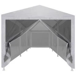 Fabriquée en acier enduit de poudre, cette tente de réception est extrêmement durable. Le revêtement de toiture est en polyéthylène de haute qualité, ce qui le rend résistant à l’eau et aux UV. La tente dispose de huit parois latérales en maille qui vous protègent des insectes nuisibles. L’une des parois latérales a une entrée à fermeture éclair pour un accès facile. La tente de réception est facile à installer avec les accessoires de montage inclus.